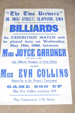 Advertising poster - The Two Brewers, 114 High St, Clapman SW4, Billiards, an exhibition match will be played here on Wednesday May 14th 1930 between Miss Joyce Gardner and Eva Collins, poster mounted on a board back, 76cm high