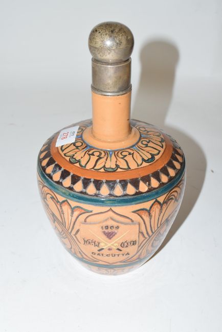 Early 19th century stoneware flask with white metal mounted stopper and collar, the body decorated with a shield for New Club Calcutta (snooker and billiards) and dated 1909, the body decorated with scrolled foliage detail, faint impressed marks to base, possibly Doulton, 7cm high