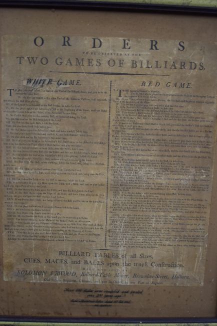 18th century Orders to be observed at the two games of Billiards, the white game and the red game, printed for Soloman Erwood Billiard Table maker, Brownlow St, Holborn, undated, paper laid on board, framed but not glazed, 63cm high