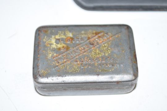 Small 19th century black papier mache snuff box, the lid decorated with a printed scene of billiard players together with further small tin marked 'The Handy Outfit', largest piece 9.5cm wide