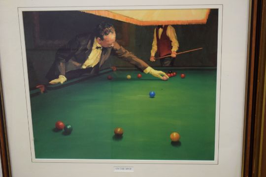 Mixed Lot comprising framed black and white photograph, snooker scene, together with a further early Boys Billiard Championship Winner with trophy and a further coloured print 'On the Spot', largest 63cm wide (3)
