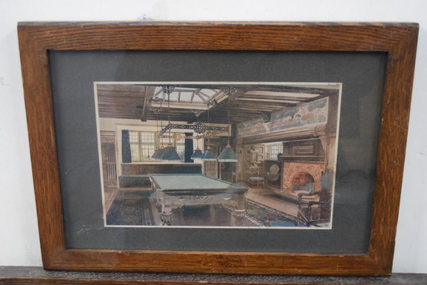 Mixed lot - coloured print 'The Fluker' together with a further coloured print, interior scene with snooker table, both f/g, largest 50cm wide (2)