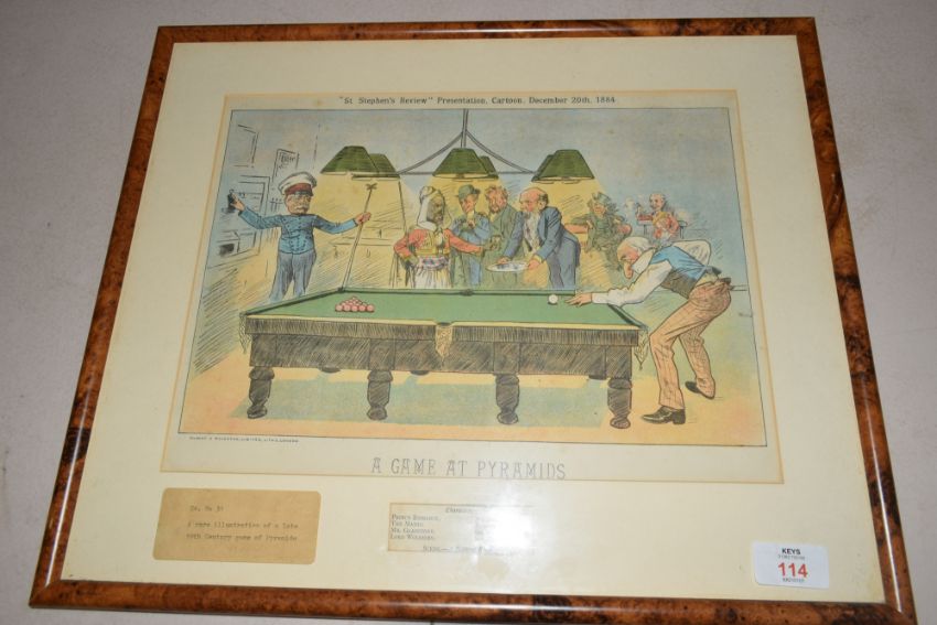 St Stephens Review presentation cartoon, December 20th 1984, 'A game at Pyramids', coloured print, f/g, 46cm wide
