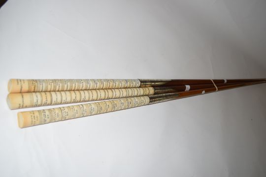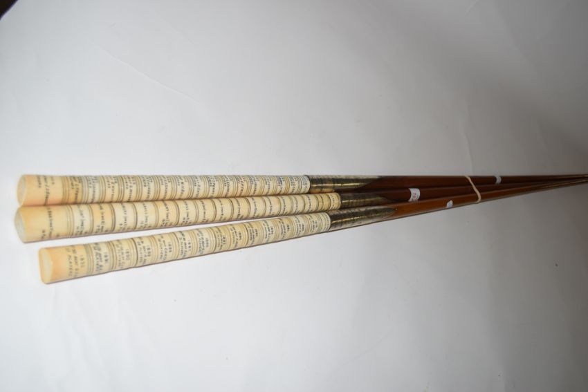Group of Royal Southampton Yacht Club Burroughes & Watts ivory butted cues, the ivory noting champions beginning with the date 1879 (3)
