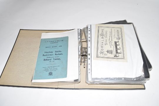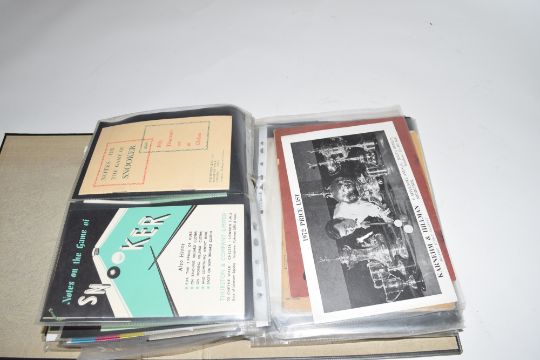 Black lever arch file containing a large collection various snooker and billiards related ephemera to include Norval & Sons, Glasgow automatic billiard ball returner pamphlet, The Billiard Table Buyers Guide by Harold Holt Billiards Ltd, Blackpool, J & E Ascott, Stratford, London price list 1930/31, various souvenir programmes to include snooker exhibitions by Joe Davis, November 1939, Professional Billiards Players Association programme for the first annual All Star Charity Show Christmas Eve 1947 bearing signatures, The British Legion Billiards & Snooker Exhibition, Wednesday November 6th 1946 programme bearing signatures and many other items