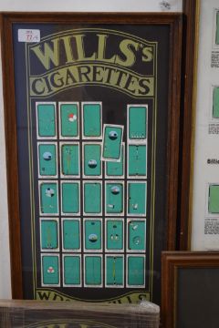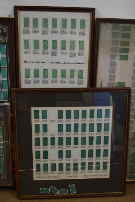 Five framed groups of cigarette cards relating to billiards comprising Foursome Cigarettes, billiards by Willie Smith, Wills Cigarettes, billiards by Tom Newman by Ogdens Cigarettes, Billiards by John Roberts issued by Wills Cigarettes, largest frame 116cm wide (5)