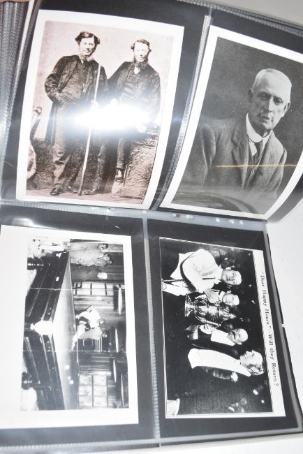 Grey folder containing range various black and white photographs and prints, various early 20th century snooker and billiards celebrities and others
