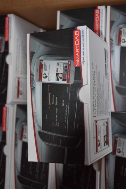 Box containing 20 SmartDAB, Wireless in-car DAB adapter with dedicated app. Please note Item instructions does state that an aerial is included, this is incorrect – NO aerial included.