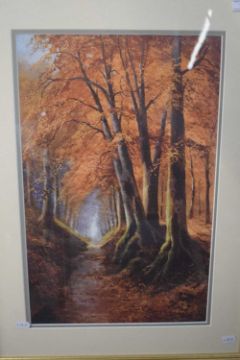 After Reginald Daniel Sherrin (British, 20th century) Autumnal woodland scene, chromolithograph, 19x12.5ins, framed and glazed.
