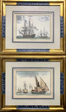 After Passebon Equitis (French, 18th Century) 'Bremond Sur Le Portau Coin De Reboul' and 'Vaisscau D'Admiral, hand coloured engraving(s), 7.5x10.5ins, framed and glazed (2)