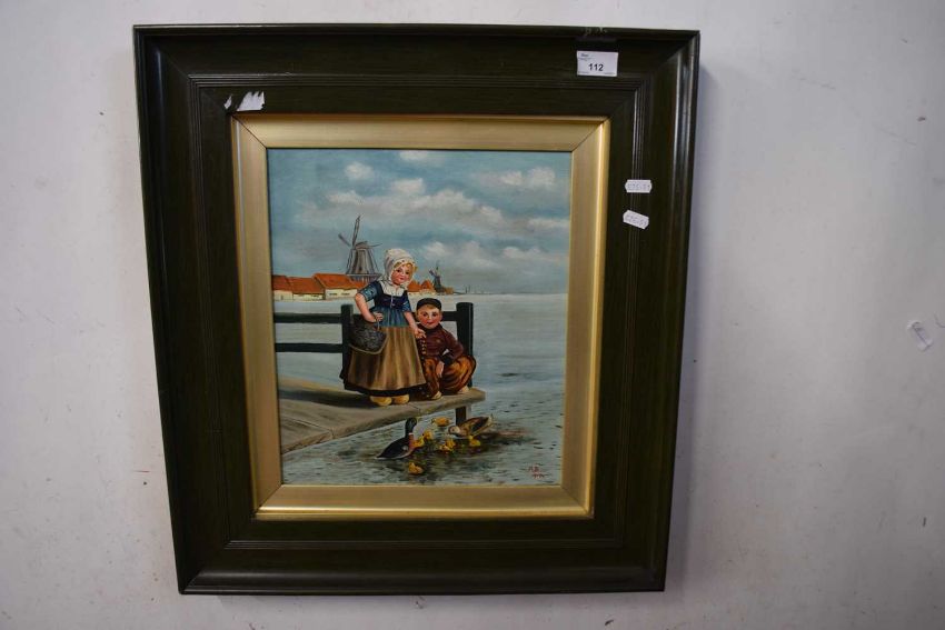 Early 20th Century, two children feeding ducks, initialled A.B and dated 1910, oil on canvas,13.5x11.5ins, framed.