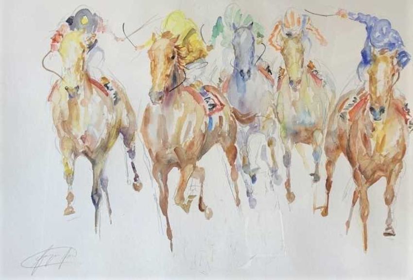 British, contemporary, horse racing study, watercolour and pencil, indistinctly signed in pencil,14x22ins, framed and glazed.