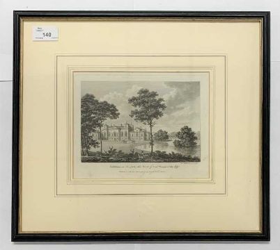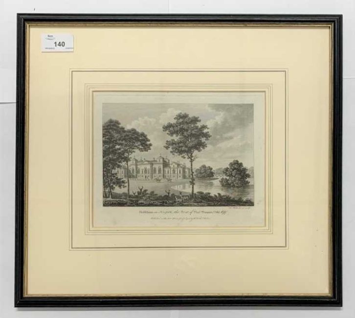William Watts (British,19th century), 'Holkham in Norfolk, the Seat of Thomas Wenman Coke Esqr', engraving, pub.1782, 5x7ins, framed and glazed.