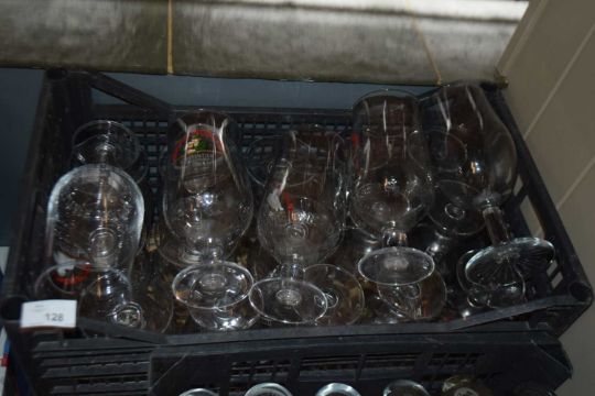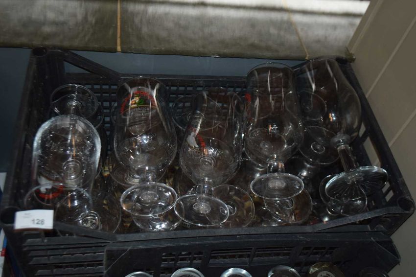 Box containing mixed branded pint glasses to include Moretti and San Miguel