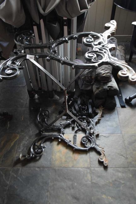 Cast iron table base, 85cm long x 60 cm, height 69 cm