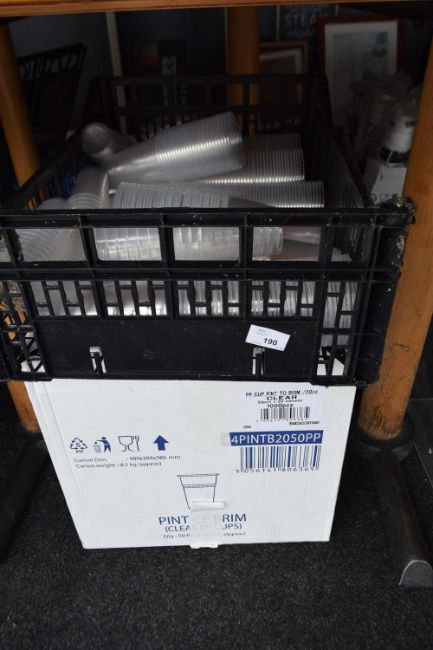 Box containing pint CE brim clear plastic cups, approx 800 pieces together with a further crate of mixed plastic cups