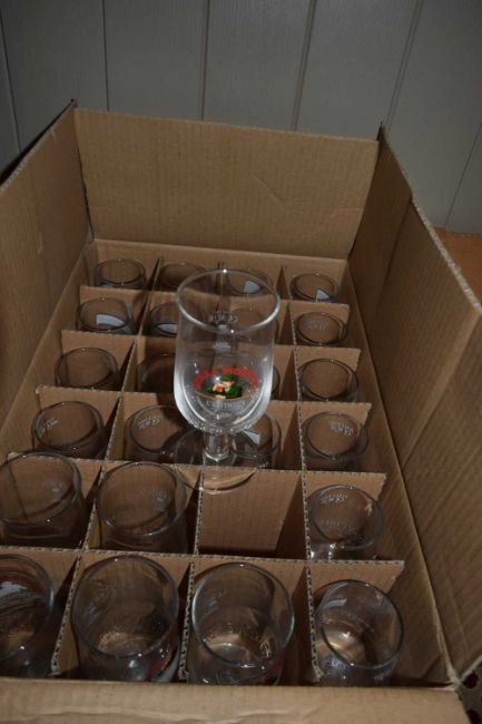 Box of mixed branded glass ware to include San Miguel and Moretti, approx 24 half pint glasses