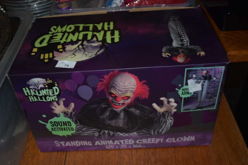 Haunted Hallows sound activated standing animated creepy clown, 120 x 20 x 166 cm