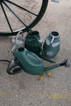 Five various watering cans