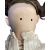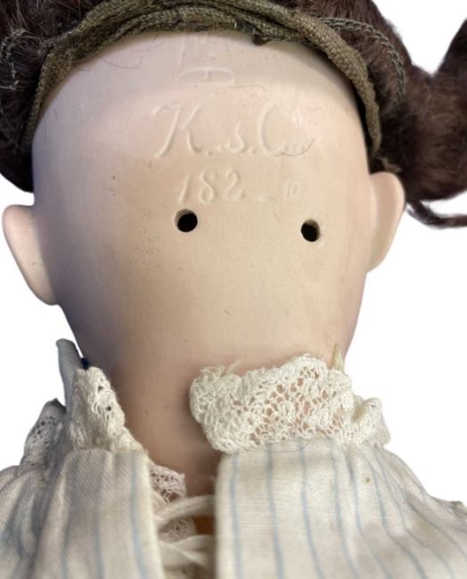 German bisque head doll in white and blue striped dress. Blue eyes and brown hair. Marked to back of head K&Co 182-10.