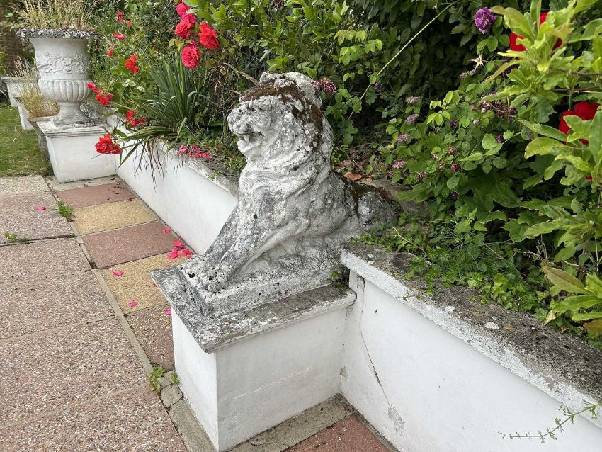 Pair of composite seated lions, height approx 80cm, length approx 110cm