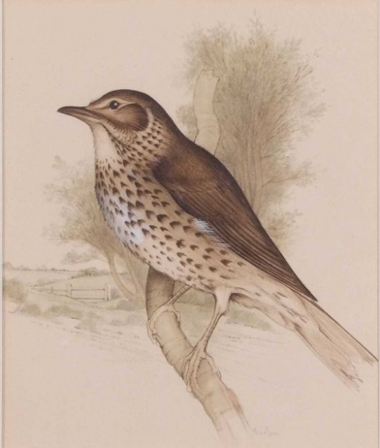 Edna Bizon (British, 20th century) A song thrush perched on a small branch, watercolour, signed, 9x8ins, framed and glazed.