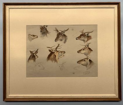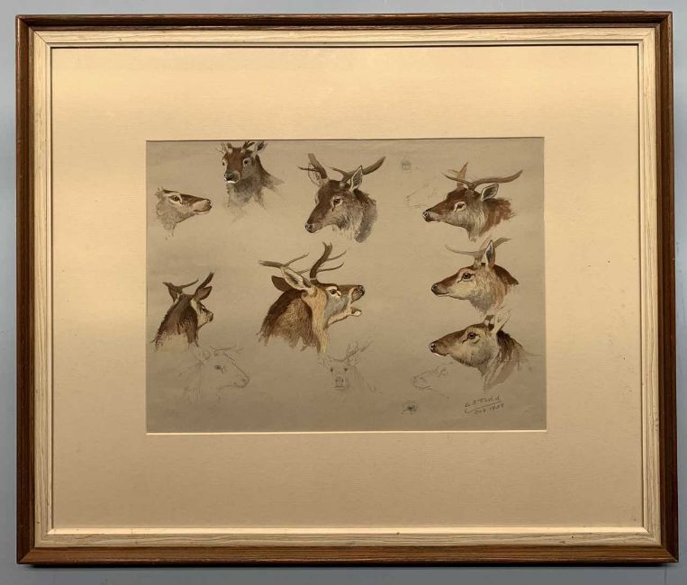 Charles Stanley Todd (British,1923-2004), a head study of a red deer stag in varying profiles, watercolour, gouache and pencil on paper, signed and dated Oct 1958 in pencil, mounted, framed and glazed, 14x10.5ins, 23x19ins inclusive of frame.