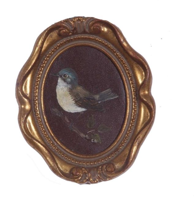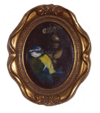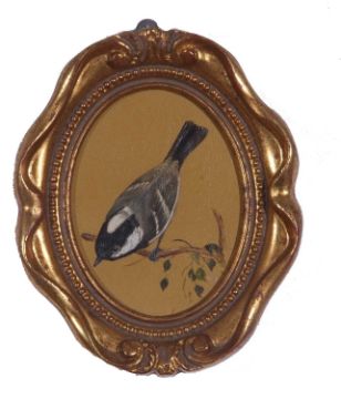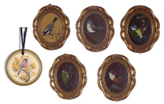 E.Howard (British, 20th Century), six miniature hand-painted ornithological studies on leather, examples include woodpecker, coal tit, whitethroat and blue tit, framed. 3x2ins, approx.(6)