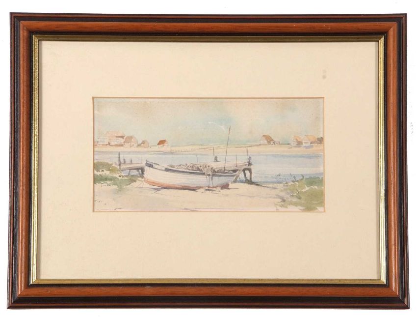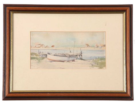 Jason Partner (British, 20th century), Beached boat at Overy Staithe, watercolour, signed and dated '74, 10x20cm, framed and glazed