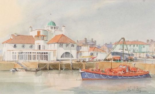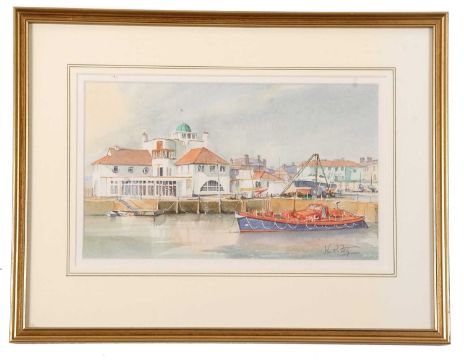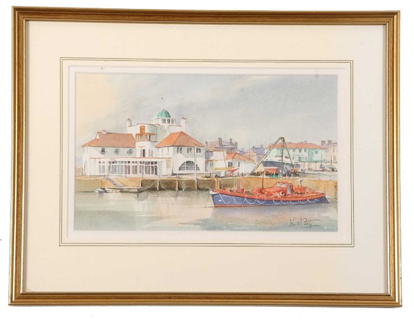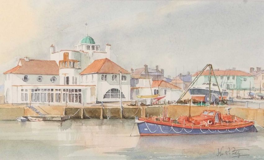 John R. Pretty (British, 20th century), Lowestoft Marina, watercolour, signed, 15x25cm, framed and glazed.