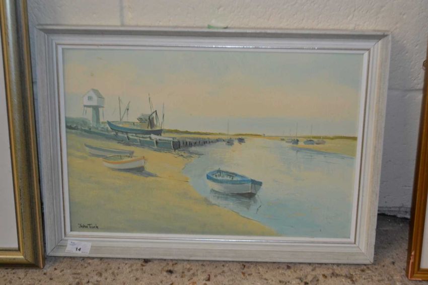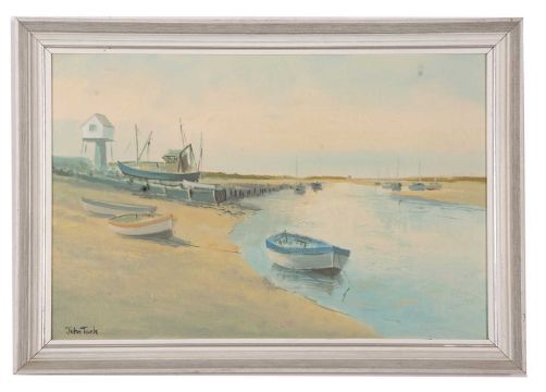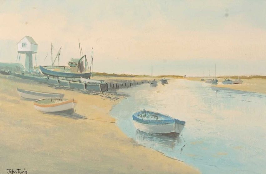 John Tuck (British, 20th century), Moored boats in North Norfolk estuary, oil on board, signed,11.5x17.5ins, framed.