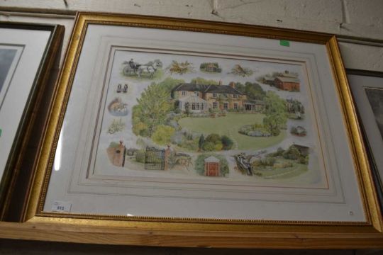K.F. Robins (British, 20th century), a central composition of a Country house with a series of vignettes of the environs, watercolour, signed, 36x53cm, framed and glazed.