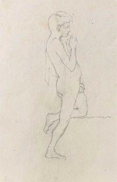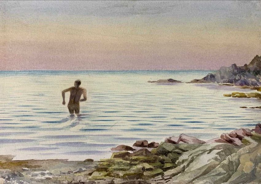 Attributed to Graham Dudley Page FRSA (British, B.1905), Talland Bay, Cornwall, watercolour, 7.5x10ins, signed in pencil, plus five male nude studies in various poses on three paper sheets, unsigned, 6.5x5ins, 3.5x5.5ins approx. (4)