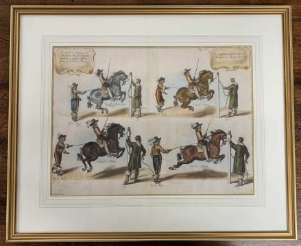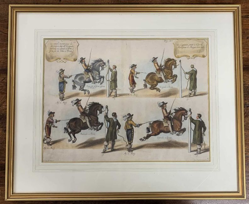 Lucas Vorsterman after Abraham Van Diepenbeek (Dutch,1596-1675), 'Le Capitaine estant a Cheval Monseigneur Le Marquis Donne Lecon', Methode et invention nouvelle de dresser Les Chevaux, circa 1737, plate 27 of William Cavendish's exposition on the theory and practice of equestrian dressage, hand coloured copper plate engraving, Sotheran' label on verso, 38x51cm, framed and glazed.