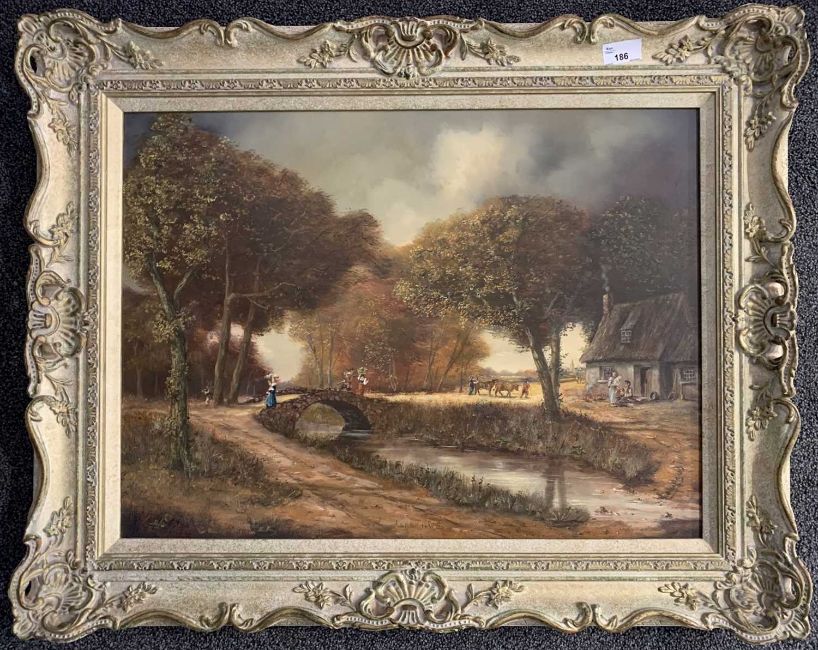 John Micheal Parker (British, b.1957), a rural community scene, oil on canvas, 44x59cm, framed.