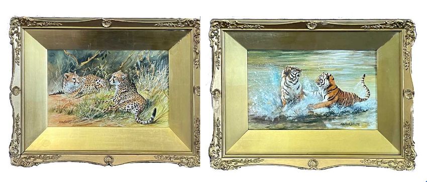 Mollie Everett Field (British, b.1939), a pair of tigers play in water, plus a pair of cheetahs at rest in grassland, watercolours and gouache, each signed and dated 1998, 6.5x10ins, framed and glazed (2)