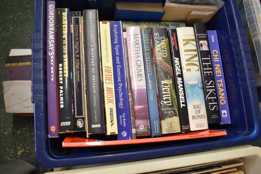 Two boxes of various hardback and softback books including steam railways, military, historical etc