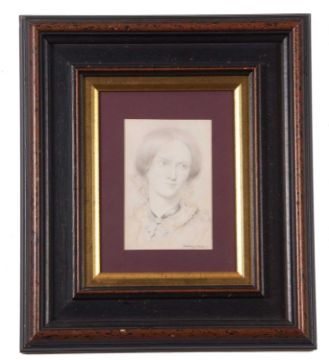 Laurence M. Kinsley (British, 20th century), after George Richmond, Head and shoulders portrait of Charlotte Bronte, pencil on paper, signed, 4x5.5ins, framed and glazed.