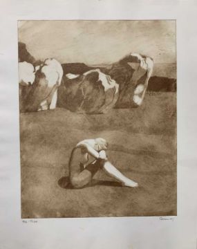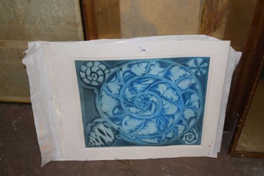 Attributed to Christopher Peakome (British, 20th century), Sepia aquatint 'Triad', signed and dated '87, numbered 4/50in pencil, unframed, unglazed, plus another aquatint in colours, unsigned, unframed (2)