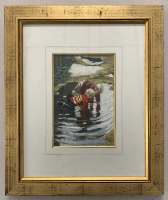 Anne Bull (British, contemporary), 'The Puddle' oil on board, signed, 16x25cm, framed and glazed