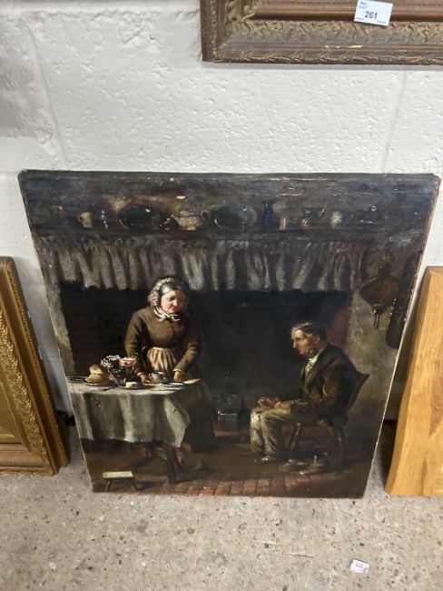 Victorian School, Interior scene depicting an elderly couple residing by a Fireplace and table, oil on canvas, indisitinctly signed on canvas (lower right) and on canvas verso in pencil, 61x74cm, unframed.
