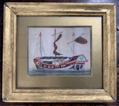 Oriental School, circa 19th century, Ship gouache on silk, 8x10cm, framed and glazed.
