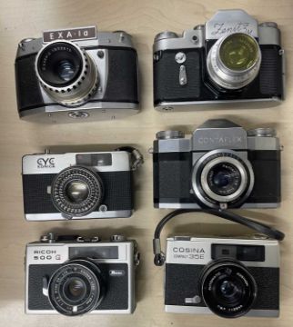 Six vintage cameras to include: EXA 1a; Zenit 3M; Konica CYCZeiss Ikon Contaflex; Ricoh 500G; Cosina Compact 35E (6)