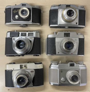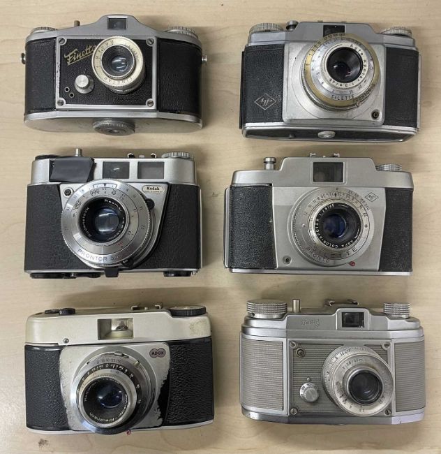 Six vintage cameras to include: Finetta; Agfa; Agfa; Kodak 500 LK; Adox Pronto; Finetta 88 (6)