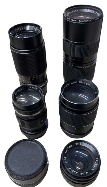 Six camera lenses, to include Super-Paragon PMC Auto Zoom 80-200mm, Prinz Galaxy F=200mm, Prinzflex Auto Reflex F=135mm, Prinz Galaxy F=135mm, Super-Paragon x2 Converter, Palinar Wide Angle F=35mm