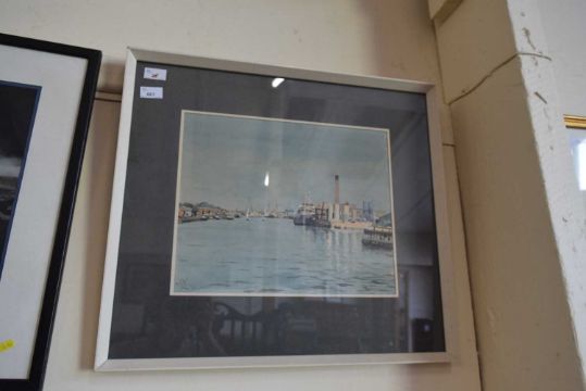 British School, 20th century, Industrial Harbour / Port scene, watercolour and gouache, indistinctly signed, dated august 1975, 32x39cm, framed and glazed.