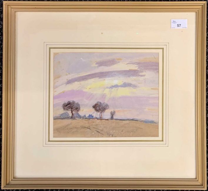 In the circle of Robert Graham Dryden Alexander (1875-1945), landscape view over a field with sunshine breaking cloud cover, watercolour, unsigned, label on verso inscribed "RGDA 1977 After RGD Alexander by daughter Clare Mann", 20x24cm, framed and glazed.