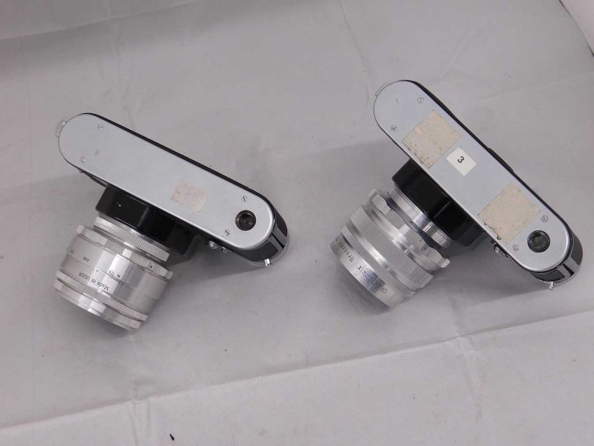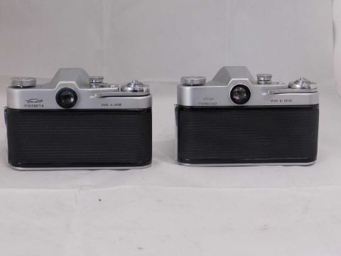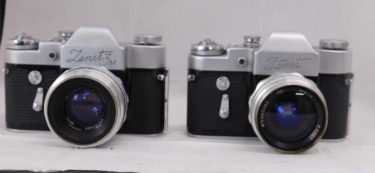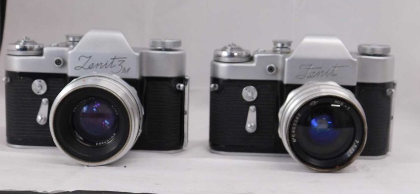 A Russian Soviet Zenit 3M, c. 1960's, serial no. 63068718 with Helios-44 lens No. 167283; and a Russian Soviet Zenit c.1960's, serial no.66013332, with MIR-1 lens serial no. 402372, (2)