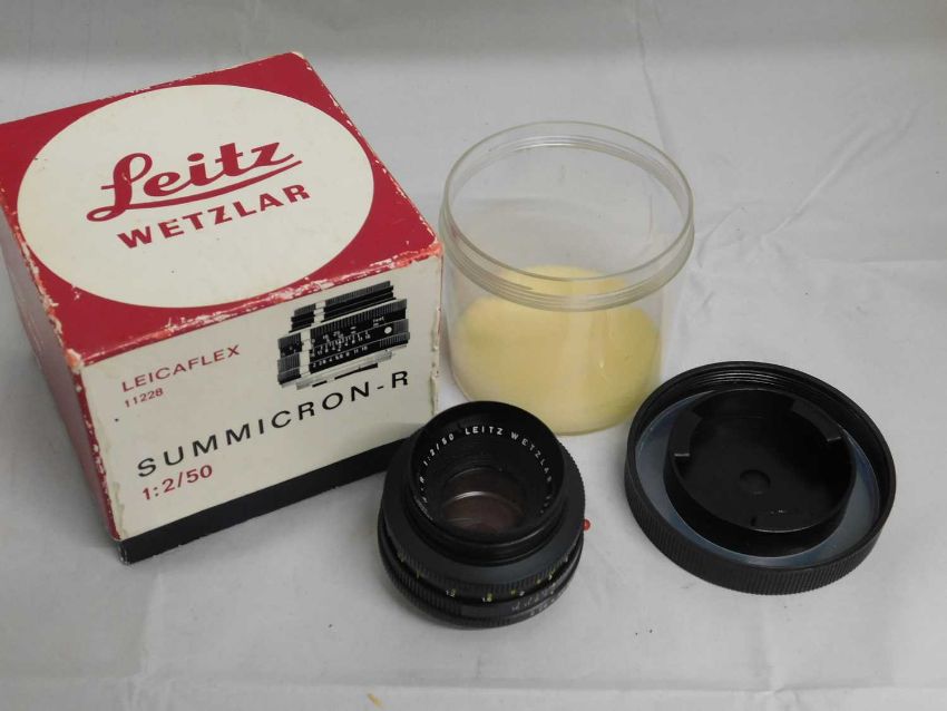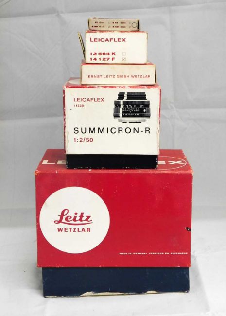 Leica: to include a Leicaflex SL camera,c.1966, serial no.1153184, boxed with guarentee card and instructions; fitted with a Leica Elmarit-R serail no.2364240; a Leicaflex Summicron-R 1:2/50 Serial No. 11228, boxed; a Leica bellows mount serial no. 16558Z, boxed; a Leicaflex Tube Adapter 14127F adapter, boxed; and Leica UV filter E3913131, boxed, (5)