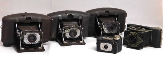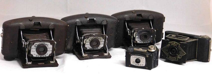 An Ensign Midget camera; three Coronet 'Vogue' camera's; and a Coronet Cameo camera, (5)